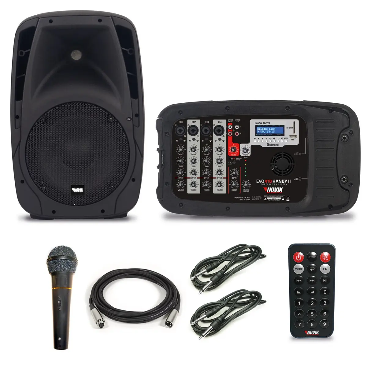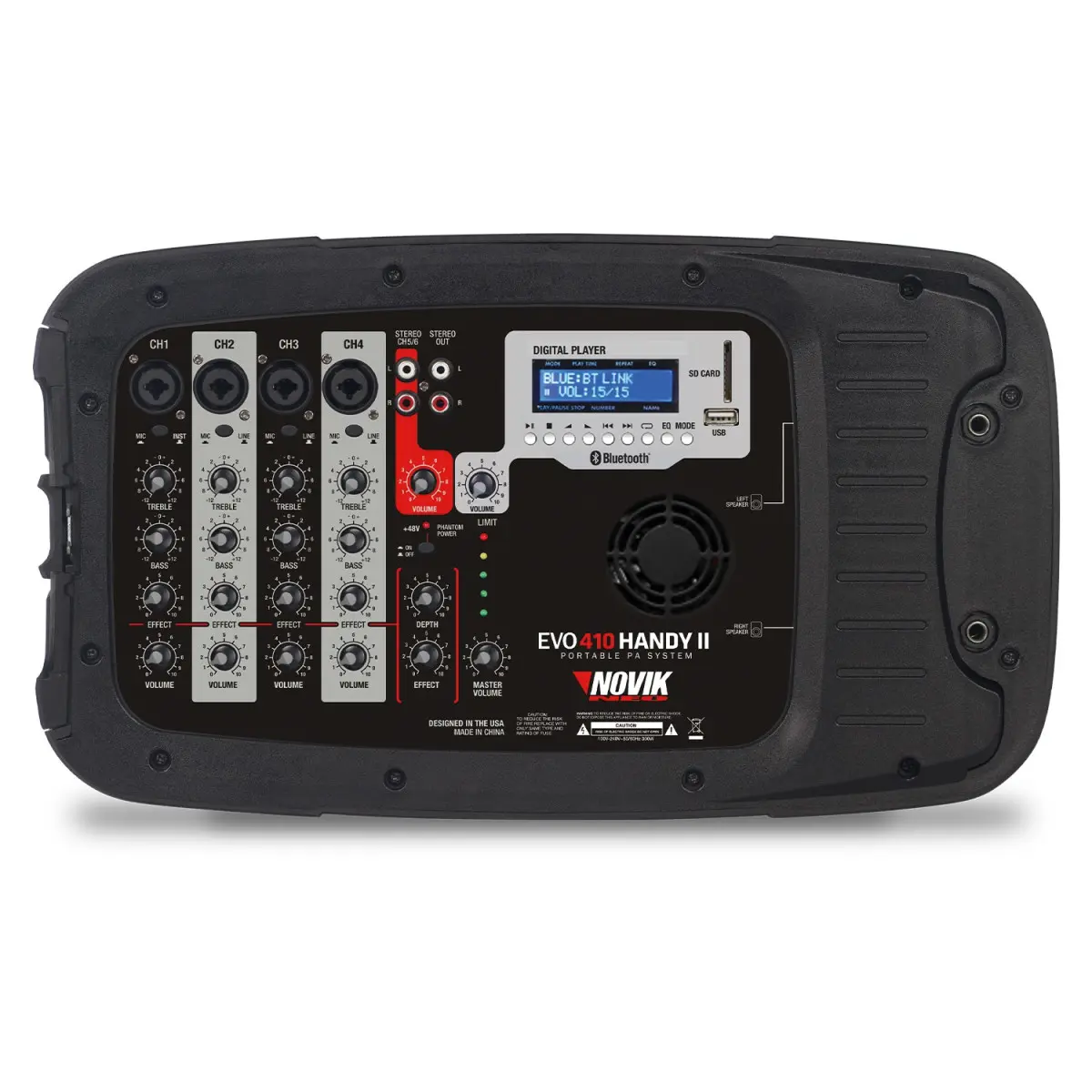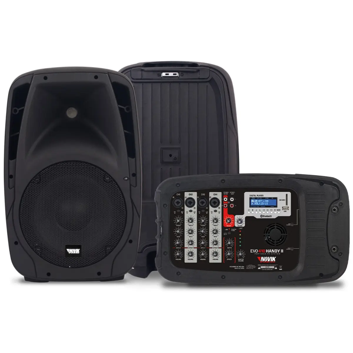 Evo 410 Handy II de Novik es el nuevo sistema de sonido todo en uno para amplificar el mejor audio en tu casa o patio. Este sistema cuenta con dos parlantes pasivos que entregan una potencia de 150w rms cada uno, una consola potenciada con 4 canales para micrófono o instrumento, ecualizador por canal y conector RCA. Además, incluye micrófono con cable, cables para conectar los parlantes a la consola y control remoto.