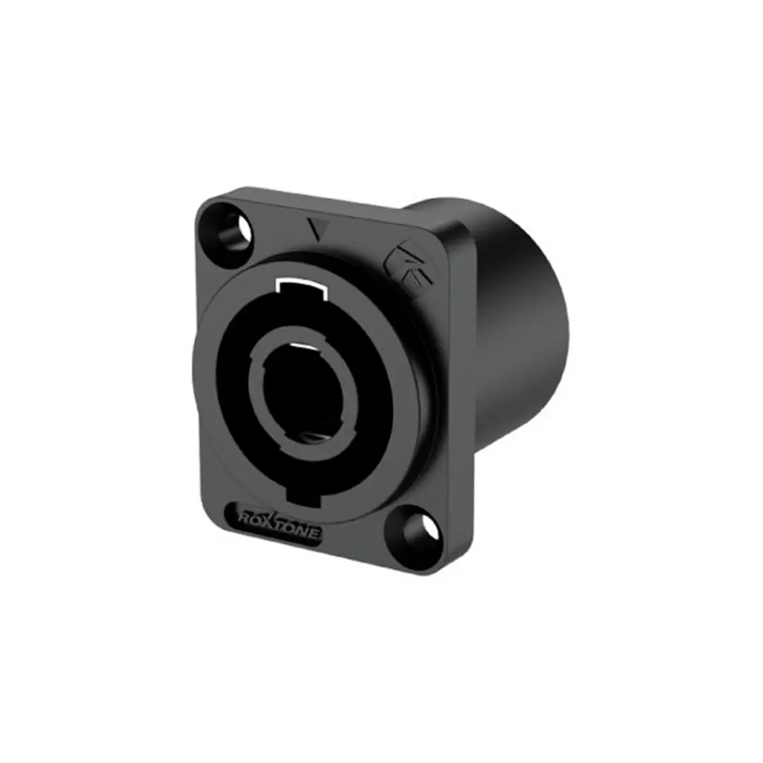El RS4MD-T de Roxtone es un conector Speakon macho de chasis de 4 pines, diseñado para ofrecer conexiones seguras y confiables en sistemas de audio profesional.